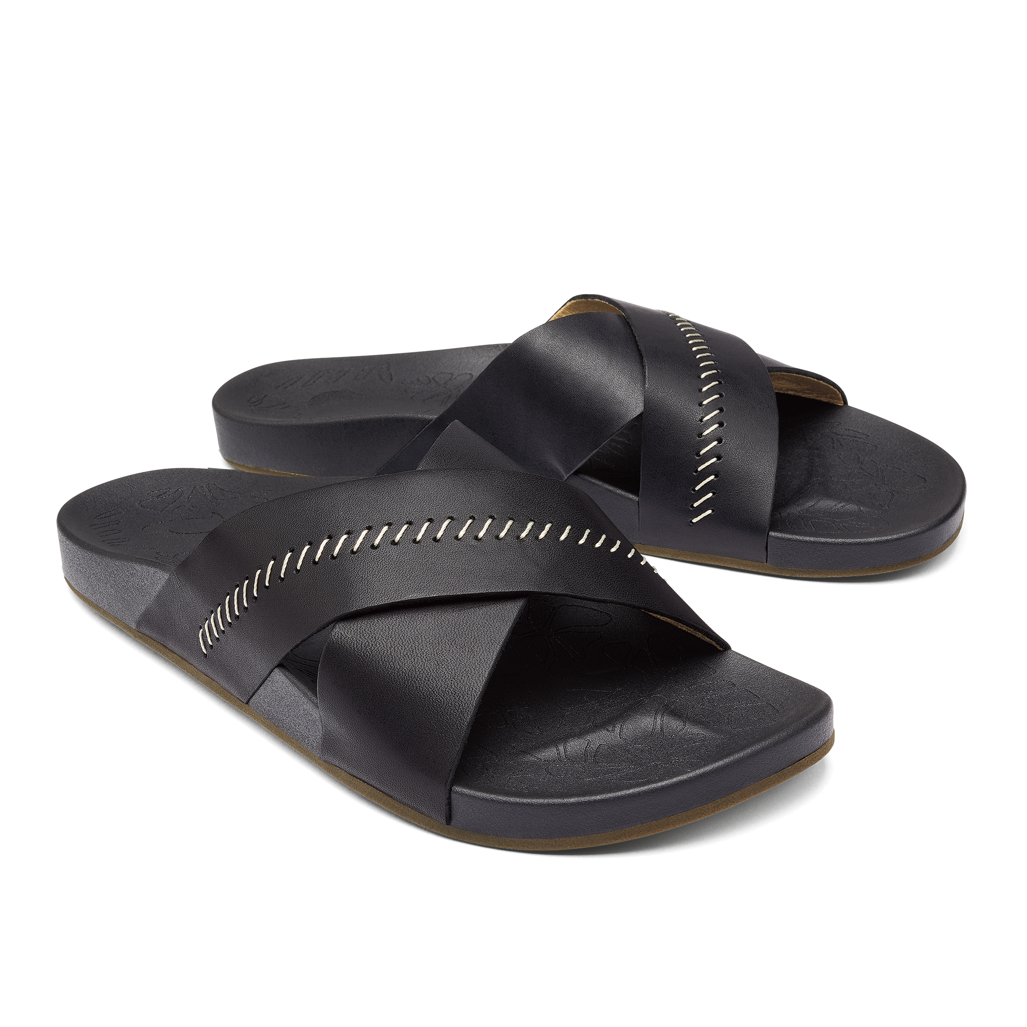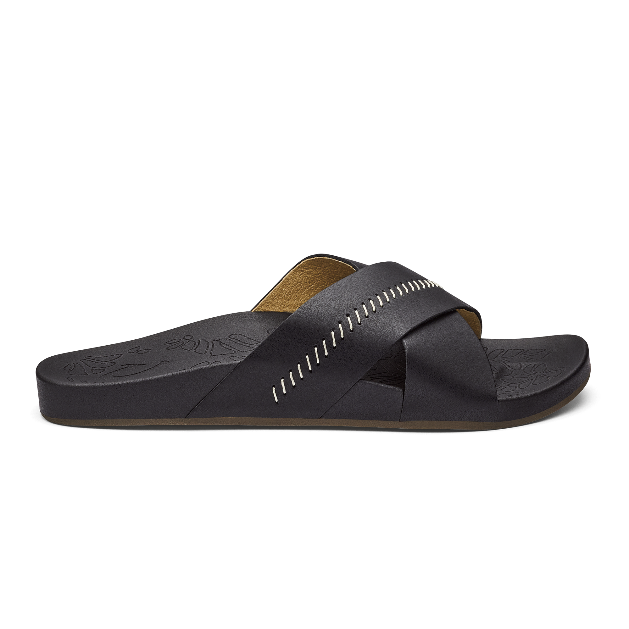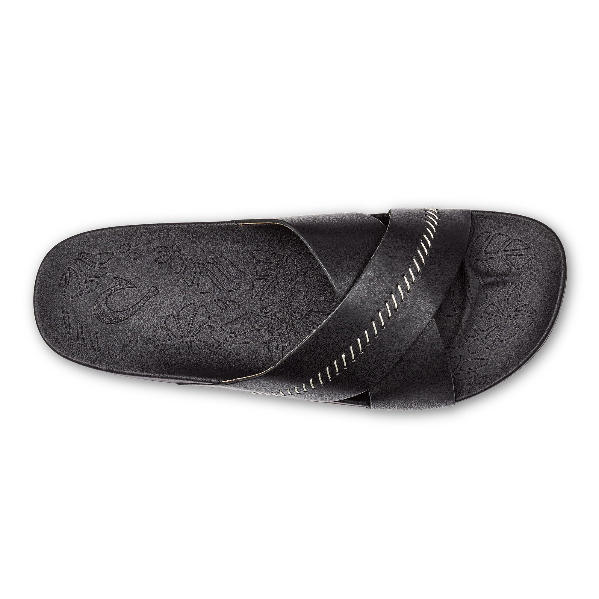 OluKai Craftsmanship: Custom stitching and delicate floral artwork on the slide reflect meticulous attention to detail. adding a distinctive handcrafted touch.