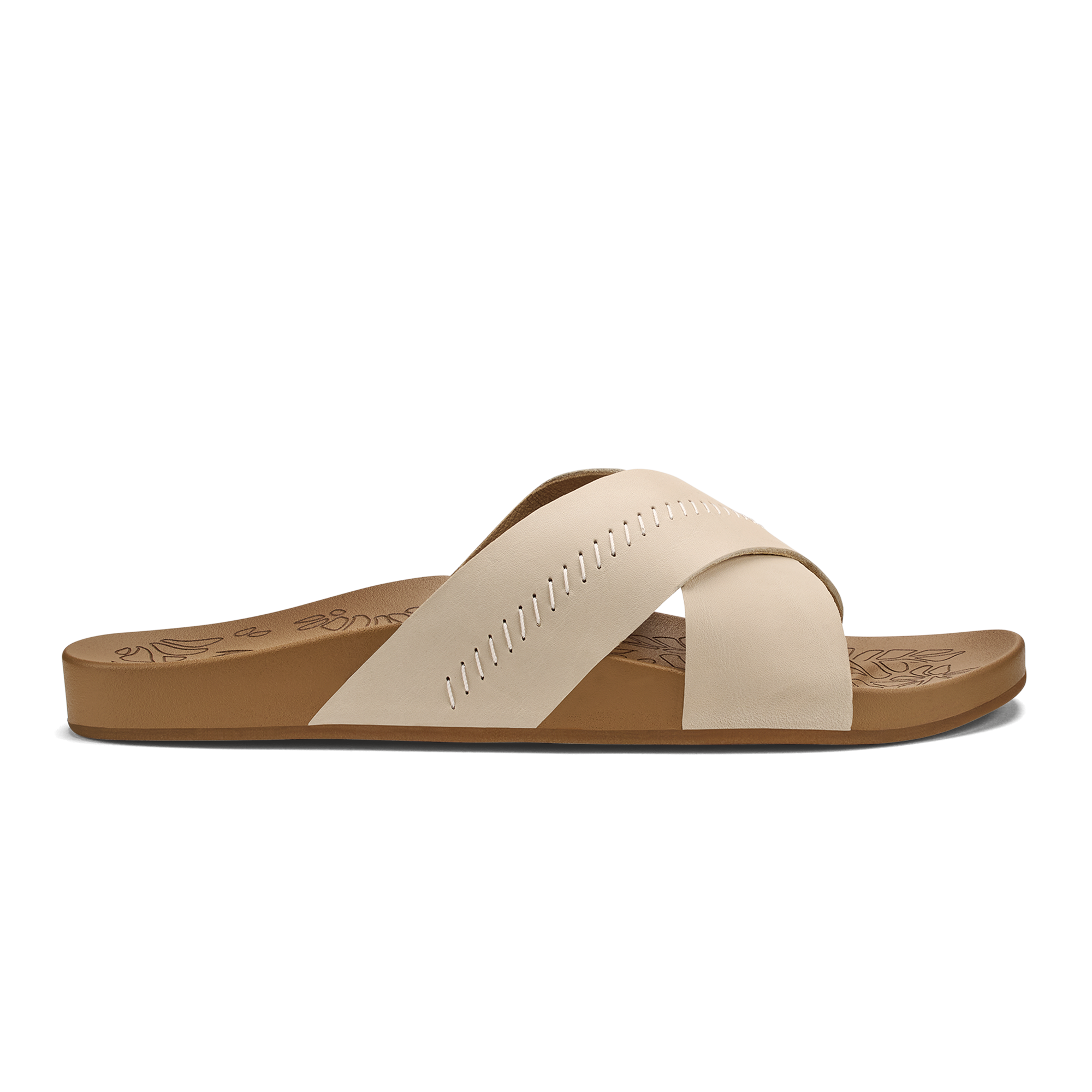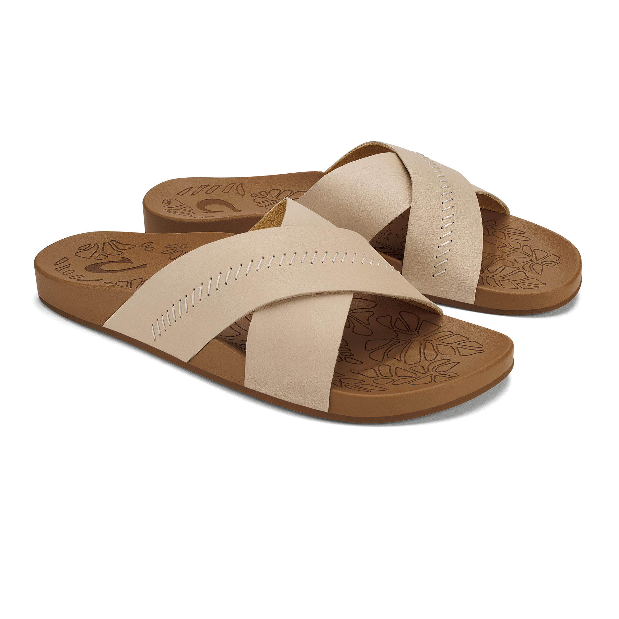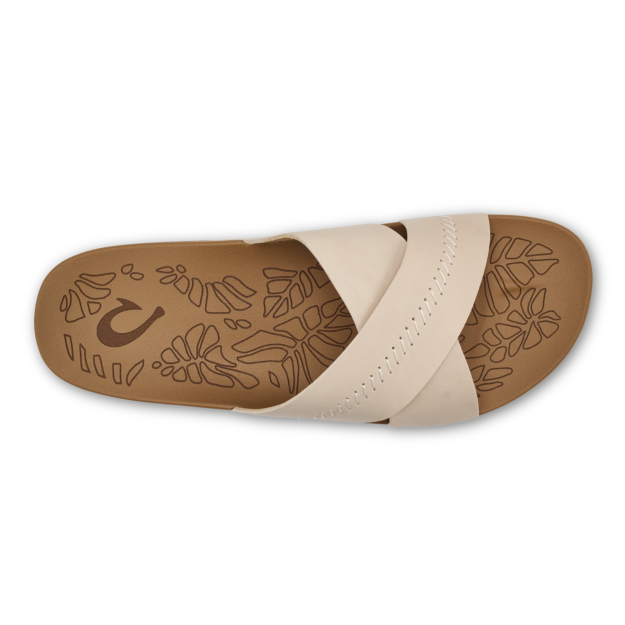 OluKai Craftsmanship: Custom stitching and delicate floral artwork on the slide reflect meticulous attention to detail. adding a distinctive handcrafted touch.