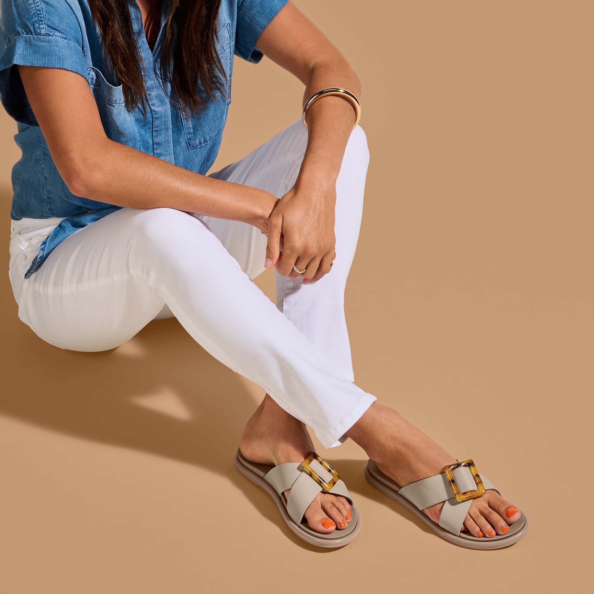 Tortoise Shell Buckle: Introducing our first sandal with an embellishment. the La’i Slide features a chic tortoise shell buckle.