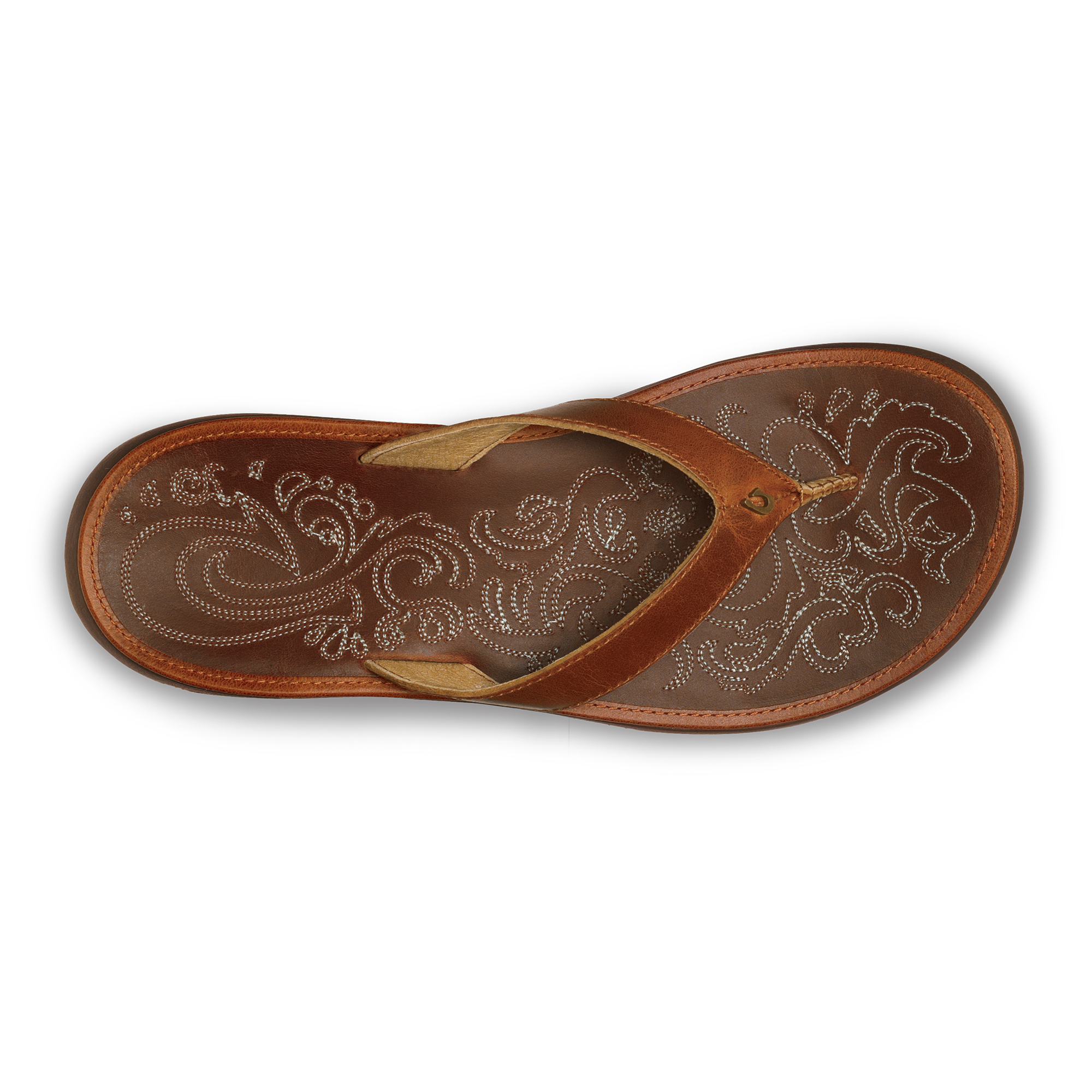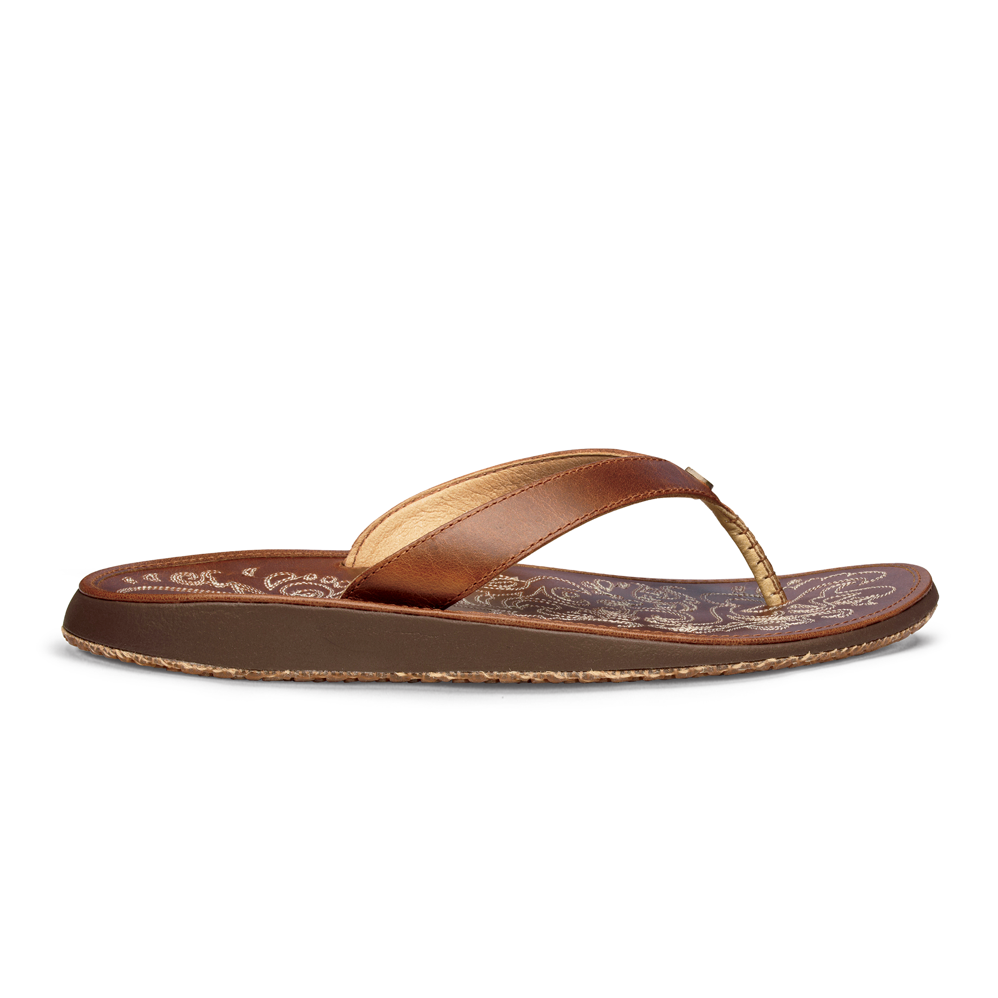 OluKai Craftsmanship: The sandal showcases double-row saddle-inspired micro stitching on the footbed. a handsewn leather toe post. and a cast metal hook logo for distinctive craftsmanship.